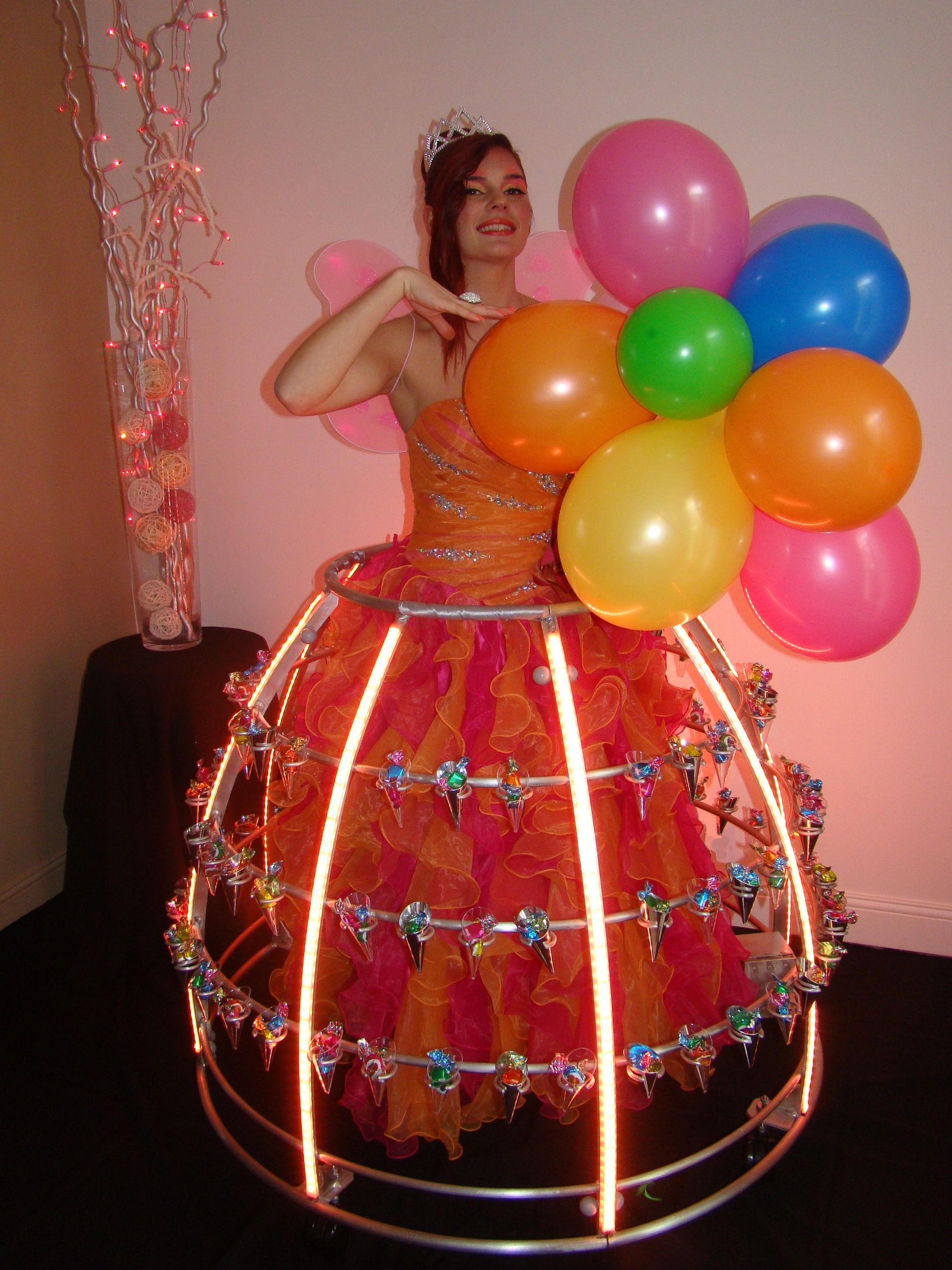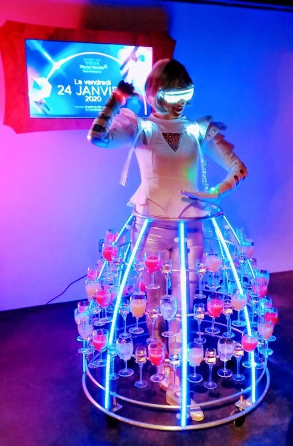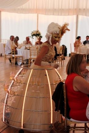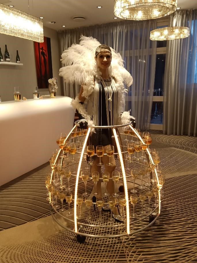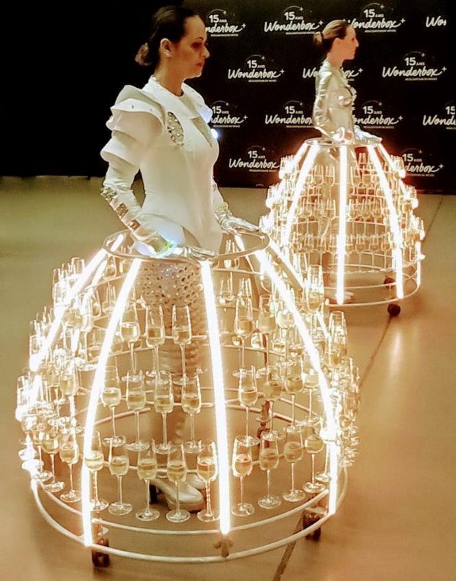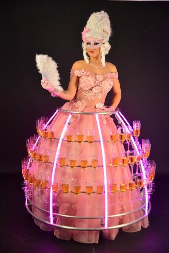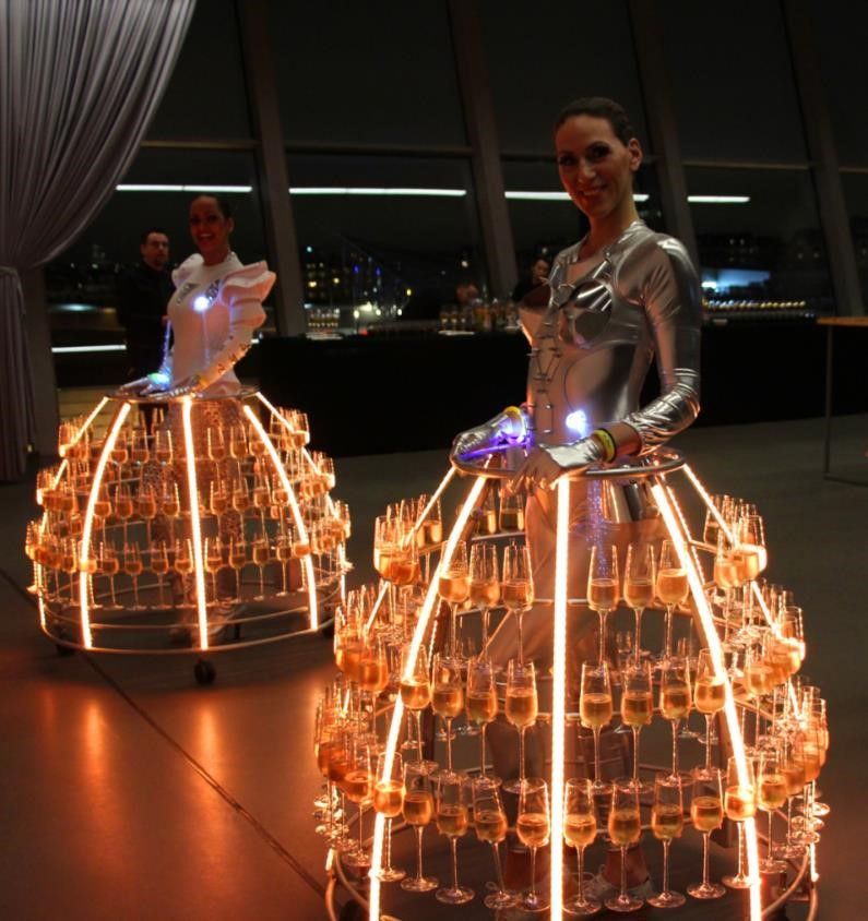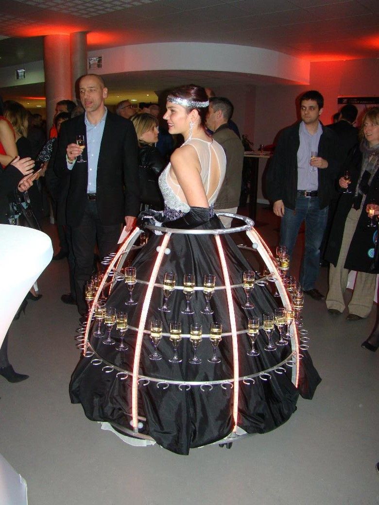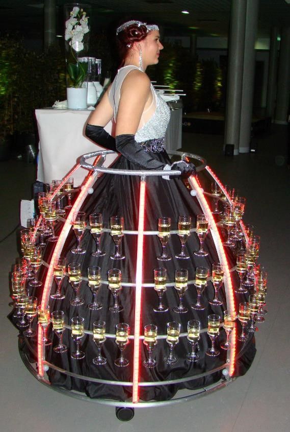 Les hôtesses, vêtues d’une élégante structure mobile en forme de robe, déambulent parmi vos invités pour leur proposer un verre ou une douceur. L’effet est spectaculaire et raffiné. Ce service fait l’unanimité auprès de vos invités, éliminant l'attente devant un buffet puisque l'hôtesse vient directement à vous.