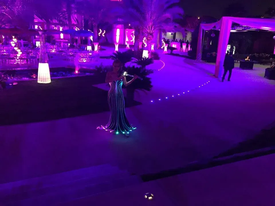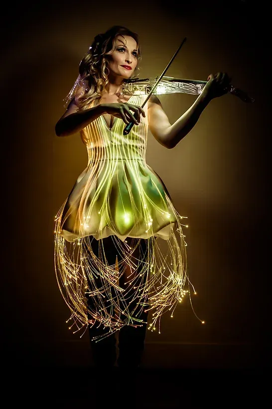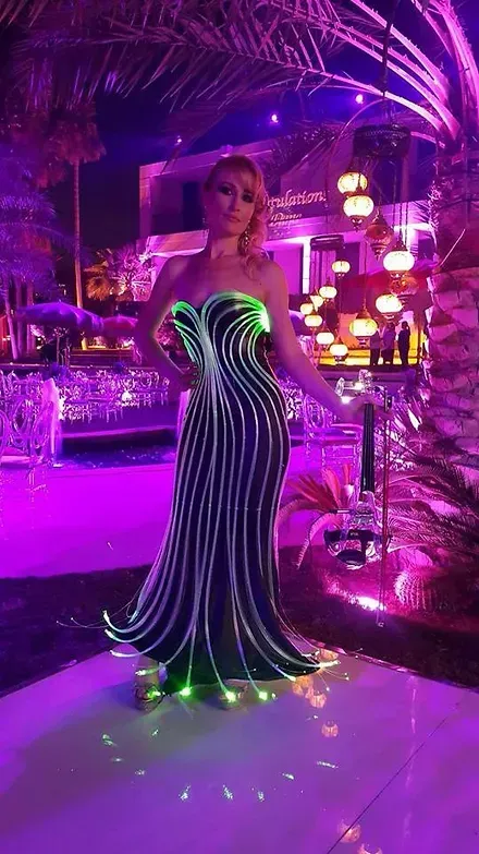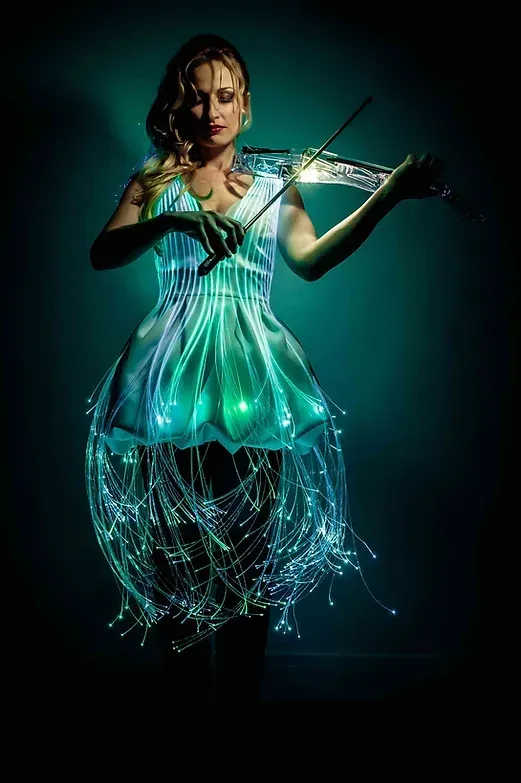 Habillée de somptueuses robes lumineuses en fibre optique ou LED, Angie allie art et technologie avec ses tenues "connectées". Pour chaque événement, elle crée un show sur mesure, avec la possibilité d’afficher le logo de votre entreprise directement sur sa robe, offrant ainsi une expérience visuelle captivante. Cette fusion unique de créativité et d’innovation est conçue pour émerveiller et ravir vos clients, en faisant de votre événement un moment inoubliable.